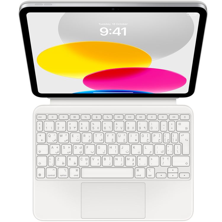 فوليو لوحة المفاتيح السحرية من آبل لجهاز الآيباد (الجيل العاشر) مع اللغة العربية، حماية أمامية وخلفية، صف مفاتيح وظيفية بـ 14 مفتاحاً، تصميم محمول ورقيق، إيماءات اللمس المتعدد، آلية المقص، قابل للتعديل إلى زوايا عرض متعددة - أبيض
