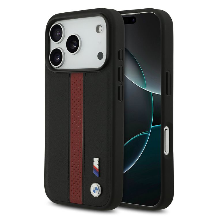غطاء BMW من الجلد PU مع خطوط مثقبة وشعارات معدنية لجهاز iPhone 17 Pro Max، متوافق مع MagSafe، تغليف مستدام، حماية من الصدمات، تصميم نحيف، سهل التركيب - أسود / أحمر