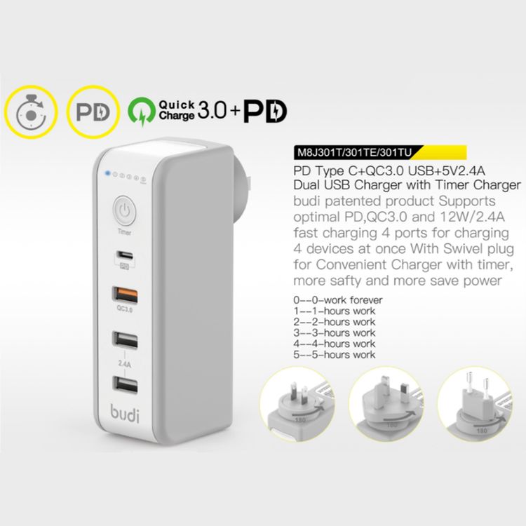 Budi M8J301TU Timer Charger PD Type Dual USB Charger 30W - Black