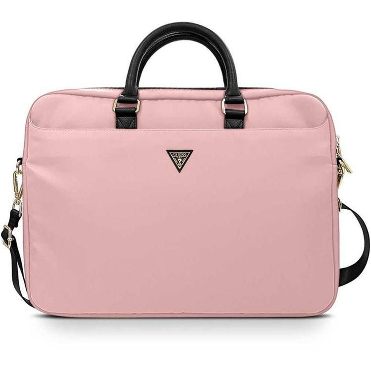 حقيبة لابتوب GUESS من مصنوعة من النايلون مقاس 15 بوصة مع شعار مثلث معدني، ومقابض حمل، وحزام كتف قابل للتعديل، وجيوب متعددة، مصنوعة من النايلون والبوليستر عالي الجودة - وردي فاتح