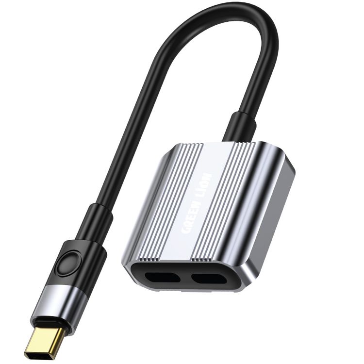 محول الفاصل Green Lion 2 في 1 من Type-C إلى نوعين Type-C، بطول 12 سم، مصنوع من سبيكة الألومنيوم والـ TPE، مخرج شحن بقوة 5V/2.4A و12 واط، مقاوم للخدوش والصدأ، يوفر تبديدًا جيدًا للحرارة، يدعم المكالمات والموسيقى والشحن والتحكم عن بعد - اللون أسود / فضي