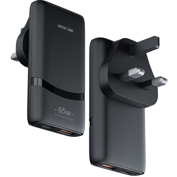 محول Green Lion Gan بمنفذ USB-C وUSB-A مصنوع من مادة PC وABS، قابس طاقة بريطاني، تصميم نحيف للغاية، حماية متعددة، تشغيل آمن، GaN متقدم، توافق عالمي - أسود