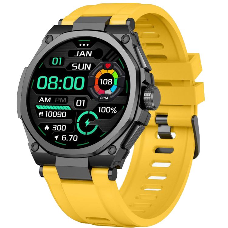 ساعة جرين ليون جراند الذكية مع علبة سوداء، شاشة TFT بحجم 1.46 بوصة، دقة 360x360، وقت عمل من 3 إلى 5 أيام، ذاكرة 128 ميجابايت، مستوى مقاومة الماء IP68، إصدار بلوتوث 5.2 و3.0 - لون أصفر.