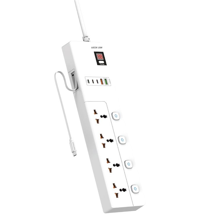 مقبس طاقة Green Lion GS-800 بطول 2 متر وقوة 3500 وات، مصنوع من مادة البولي كربونات المقاومة للحريق، 4 مقابس، 2 منفذ USB-A، 3 منافذ USB-C، منافذ توصيل بريطانية، باب أمان للأطفال، شاشة عرض رقمية للمؤقت