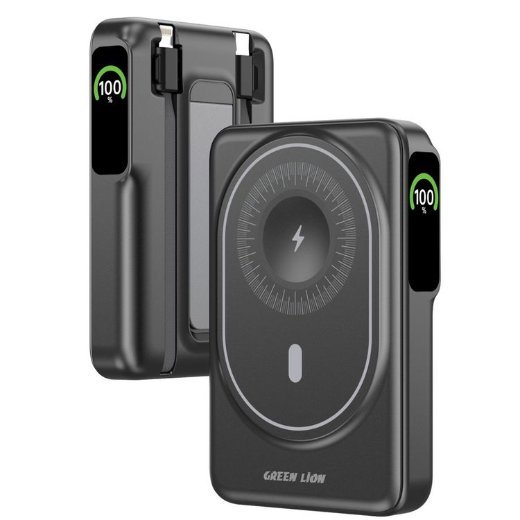 بنك الطاقة جرين ليون ماج-فيجن بقوة 10000 مللي أمبير مع كابلين مدمجين، منفذ USB-C، دعم الشحن السريع، توصيل طاقة 22.5 وات، حامل، شحن لاسلكي بقوة 15 وات - أسود