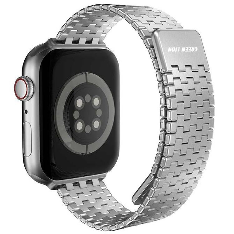 حزام ساعة "جرين ليون" من المعدن للساعات الذكية من أبل بسلسلة مقاسات 42/44/45/49 ملم مع روابط معدنية قابلة للتعديل، أنيق وراقي، مزود بإبزيم طي مزدوج الأزرار، مناسب للمناسبات الرسمية وغير الرسمية، مصنوع من الفولاذ المقاوم للصدأ - اللون فضي.