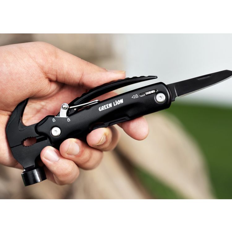 أداة متعددة الاستخدامات من Green Lion 12 في 1 بمطرقة مصنوعة من الفولاذ المقاوم للصدأ، بوجود كماشة ذات أنف طويلي، كماشة تقليدية، قاطع أسلاك، مخلع مسامير، منشار، فتاحة زجاجات، شفرة سكين، مفك براغي فيليبس، مزيل قشور السمك، مفك براغي مسطح وملف مسامير - باللون الأسود.