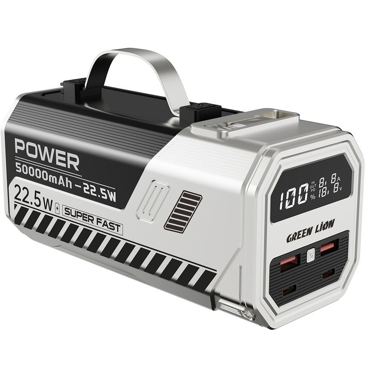 بنك طاقة Green Lion Power Max 22.5W 50000mAh، كابل مدمج قابل للسحب بطول 1.5 متر، 2 × USB-A، 2 × USB-C، شاشة رقمية، إضاءة LED - أسود/فضي