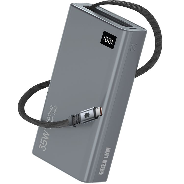 باور بانك جرين ليون قابل للسحب بسعة 20000 مللي أمبير وسرعة شحن بقوة 35 واط، مع شاشة LED وطول كابل 75 سم ومنفذ Type-C ودعم الشحن السريع - رمادي