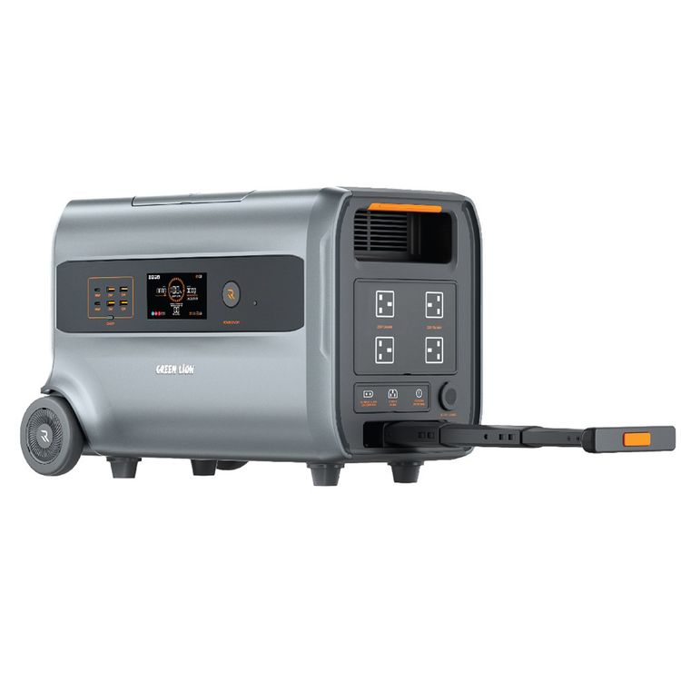 محطة الطاقة جرين ليون RG-2400 مع نظام عربة مدمج، عجلات مطاطية بحجم 4.75 بوصة، 4 منافذ كهرباء AC، 6 منافذ USB، نمط ضوء مستقر، إجمالي قوة 2780 واط، منفذ إخراج ولاعة سجائر، حماية من التحميل الزائد - رمادي
