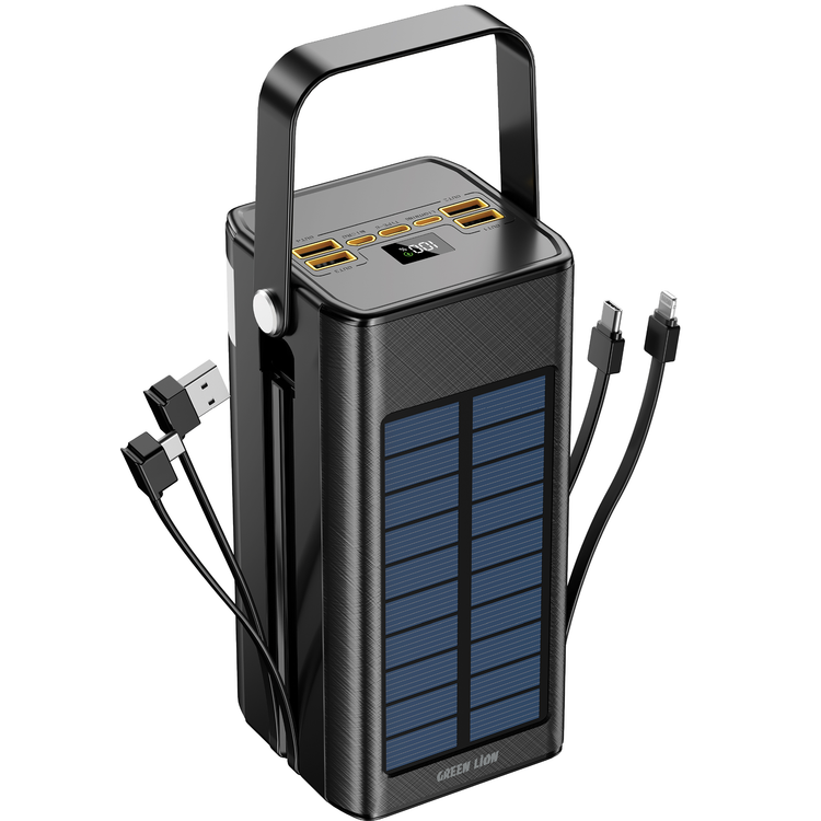 بنك الطاقة جرين ليون سولار X بسعة 80000 مللي أمبير في الساعة مع PD 20W، يدعم الشحن بالطاقة الشمسية، كابلات مدمجة، مقبض محمول، 4 منافذ USB-A للإخراج، منفذ USB-Micro، منفذ إدخال وإخراج Lightning، منفذ إخراج USB-A2/A3/A4 - اللون الأسود.