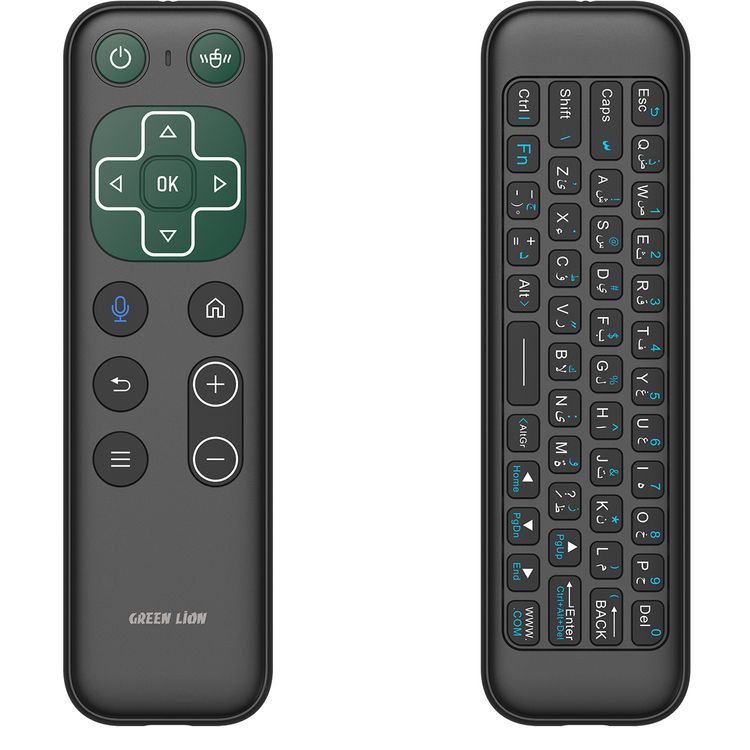 الأسد الأخضر جهاز تحكم عن بعد لاسلكي مع لوحة مفاتيح وفأرة، اتصال 2.4G + Bluetooth، دقة 1200 DPI، منفذ شحن USB-C، سعة بطارية 300 مللي أمبير، مساعد صوتي، لوحة مفاتيح صغيرة، فأرة هوائية – باللون الأسود