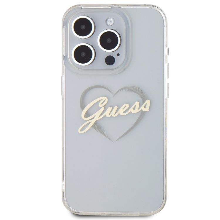 غطاء GUESS IML الصلب مع شعار قلب لهاتف iPhone 16 Pro، بملف نحيف، وسهل التركيب، ومريح للإمساك، مع فتحات دقيقة، وامتصاص للصدمات، وحماية من السقوط والارتطامات - شفاف