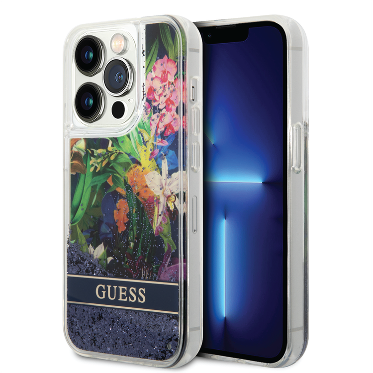 كفر حماية Guess Liquid Glitter بتصميم الزهور، لامع للغاية، ملمس ناعم، متوافق مع iPhone 14 Pro Max - أزرق
