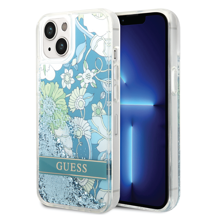 كفر حماية Guess Liquid Glitter بتصميم الزهور، لامع للغاية، ملمس ناعم، متوافق مع iPhone 14 - أخضر