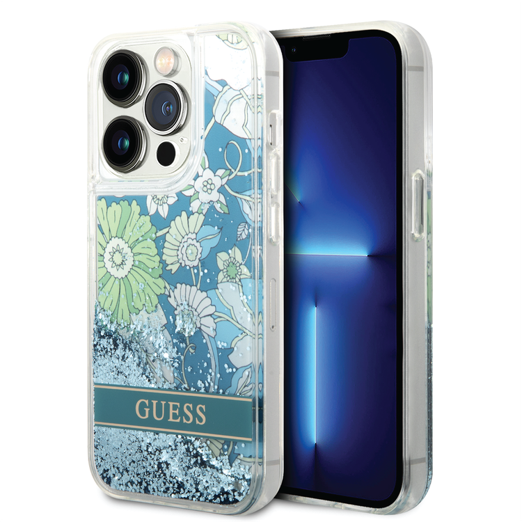 كفر حماية Guess Liquid Glitter بتصميم الزهور، لامع للغاية، ملمس ناعم، متوافق مع iPhone 14 Pro - أخضر