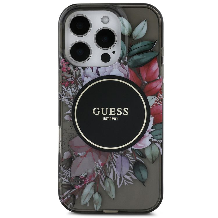 جراب ماغسيف IML الصلب بتصميم زهري وحزام لؤلؤي لهاتف آيفون 16 برو ماكس، حماية من السقوط، نحيف، فتحات دقيقة، سهل التركيب - أسود.
