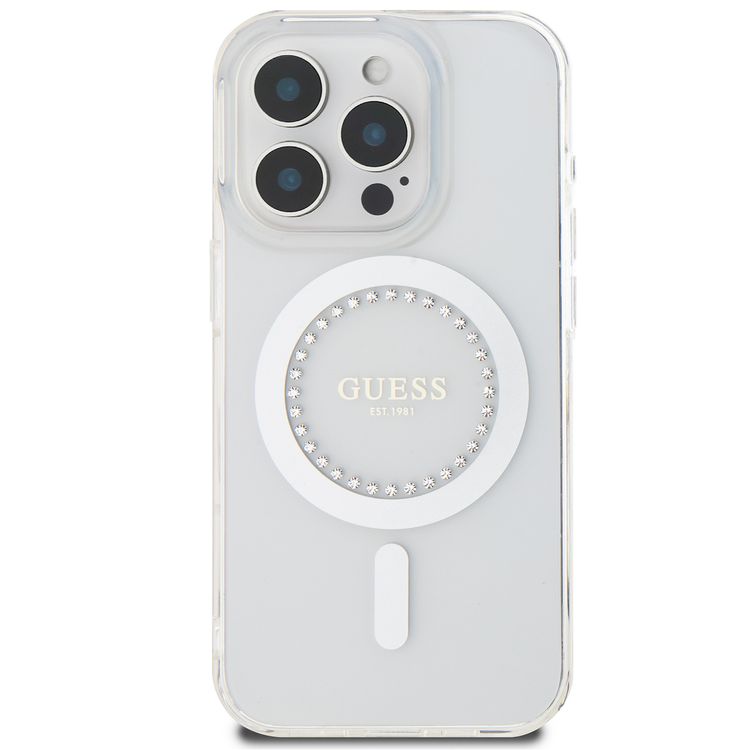 غطاء GUESS MagSafe IML الصلب بتصميم مرصع بالأحجار الكريمة لهاتف iPhone 16 Pro Max، سهل التركيب، حماية من السقوط، بملف نحيف - أبيض.