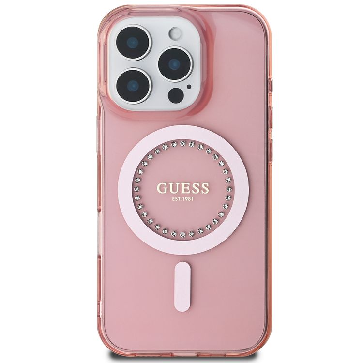 غطاء GUESS MagSafe IML بتصميم بحجارة الراين لهاتف آيفون 16 برو، تركيب سهل، حماية من السقوط، نحيف - وردي