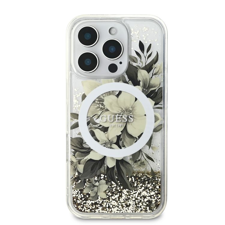 جراب GUESS Magsafe Liquid Glitter الصلب بتصميم زهور لهاتف iPhone 16 Pro، حماية من السقوط، سهل التركيب - بيج