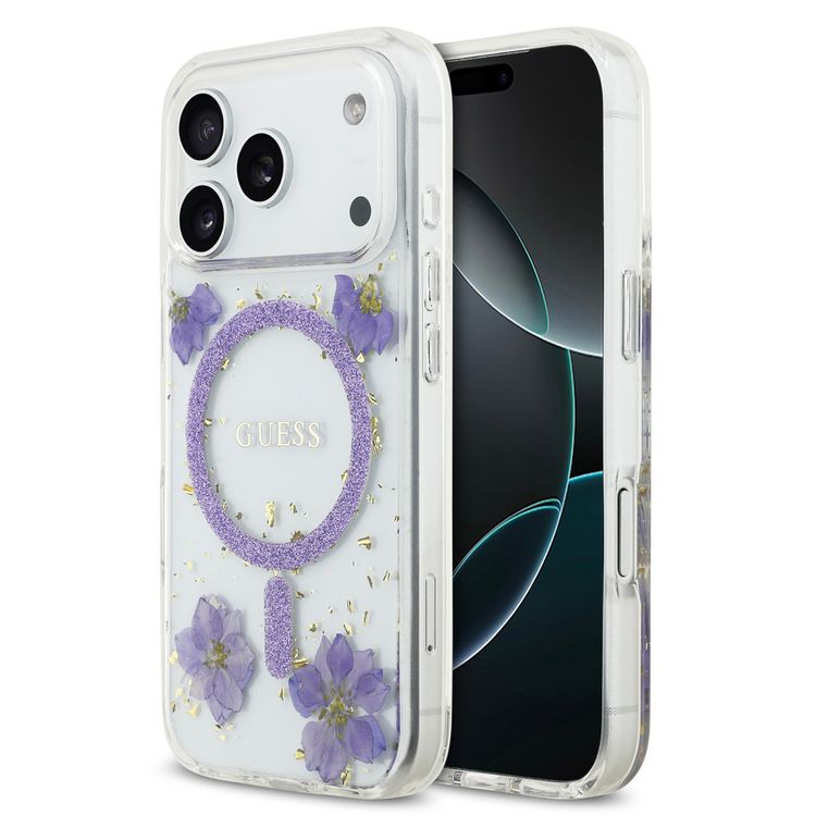 غطاء راتنج ماج سيف مع نمط الزهور واللمعان لهاتف آيفون 17 برو، تصميم نحيف، حماية من الصدمات، سهل التركيب، تغليف مستدام، قبضة مريحة، تصميم خفيف الوزن - لون أرجواني