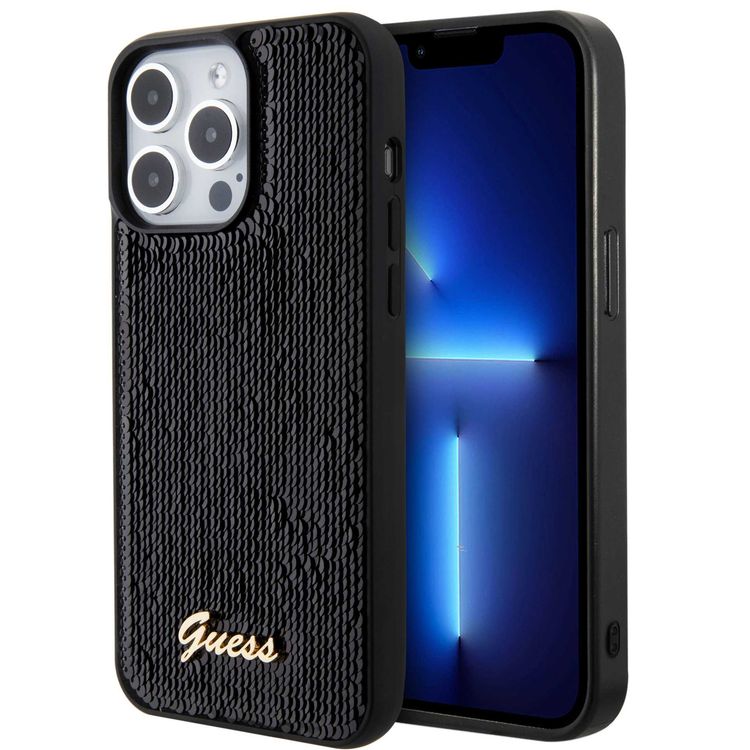 حافظة Guess Sequin Script مع شعار Guess Metal - أسود - iPhone 15 Pro Max