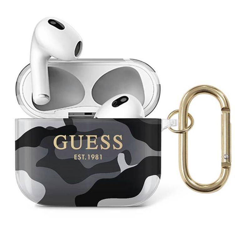 غطاء Guess Camouflage لسماعات AirPods 3 مع حماية من السقوط، ومقاوم للخدوش، بقطع دقيق، ونمط تمويه لامع وأنيق، مصنوع من TPU عالي الجودة، سهل التركيب وخفيف الوزن - أسود