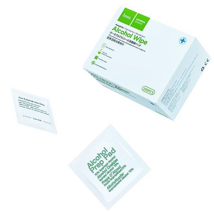 مناديل قطنية معقمة بالكحول من Hoco محمولة مع 100 قطعة لكل صندوق، حماية مضادة للميكروبات ومضادة للبكتيريا، درجة تعقيم 99%، 75% كحول وقماش غير منسوج - أبيض