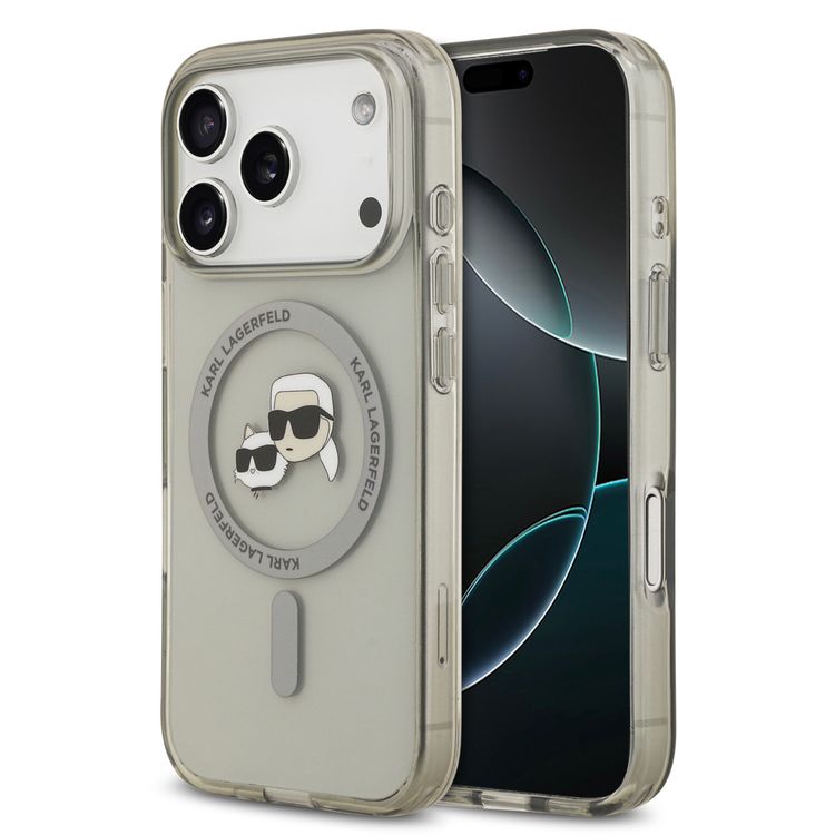 غطاء Karl Lagerfeld MagSafe IML بطبعة رؤوس Karl وChoupette لهاتف iPhone 17 Pro Max، بتغليف مستدام، حماية من السقوط، تصميم نحيف، قبضة مريحة، سهل التركيب، تصميم خفيف الوزن - رمادي شفاف