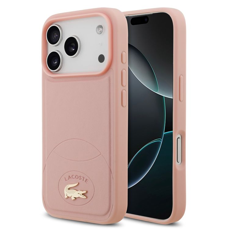 غطاء صلب من جلد PU من Lacoste بتصميم Bliss لجهاز iPhone 17 Pro، حماية من السقوط، ملف نحيف، تغليف مستدام، تصميم سهل التركيب - لون وردي