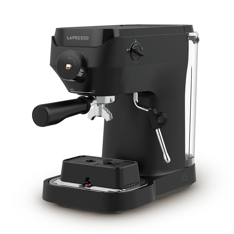 ماكينة القهوة LePresso Lucenero بضغط 19 بار مع شاشة LCD، سعة خزان المياه 1800 مل، قوة مقدرة 1600 واط، عصا بخار بدوران 360 درجة، إعدادات قابلة للتخصيص، قطر حامل الفلتر 54 مم - لون أسود