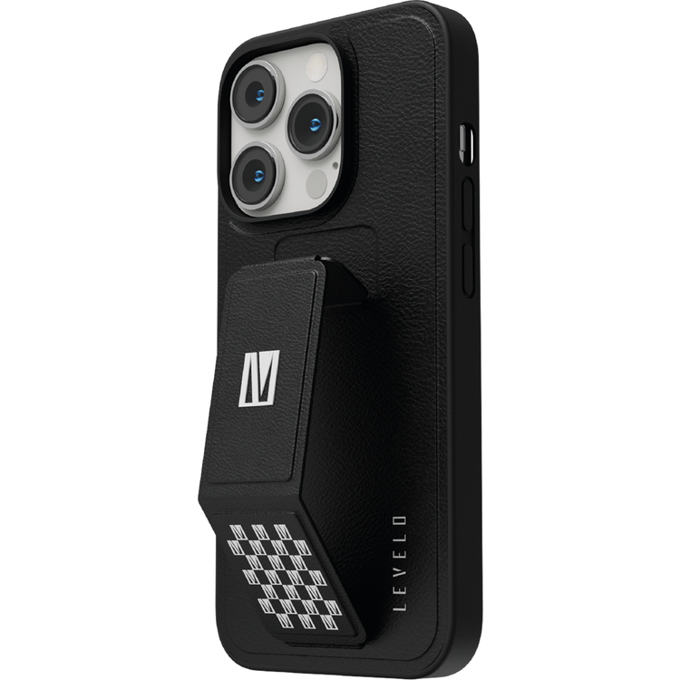 غطاء Levelo Morphix Gripstand من الجلد الصناعي لجهاز iPhone 14 Pro Max - أسود