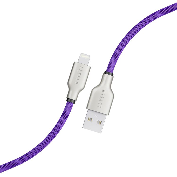 كابل Levelo Weave Net USB-A إلى Lightning، طول الكابل 1.1 متر، سرعة نقل بيانات 480 ميجابت في الثانية، عمر افتراضي لأكثر من 3000 انحناء، شحن سريع، تصميم لا يتشابك - لون بنفسجي داكن