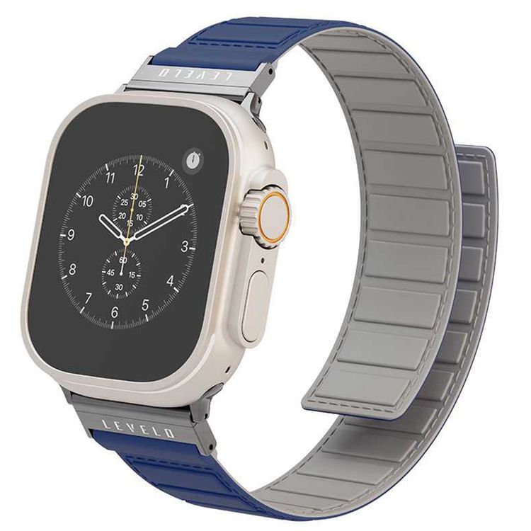 حزام ساعة من السيليكون من ليفيلو فوج مع مغناطيس لساعة آبل 49/45/22 ملم، مصنوع من مواد مضادة للحساسية، متوافق مع SE، السلسلة 8، 7، 6، 5 و4، بواجهة دوارة 360°، خفيف الوزن ومرن - أزرق / رمادي.