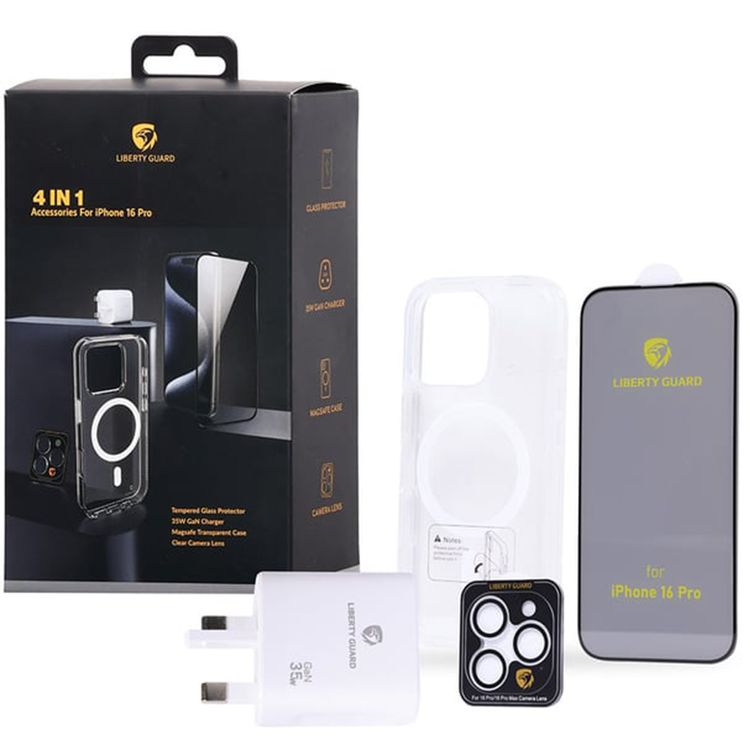 حزمة حماية Liberty Guard 4 في 1 لجهاز iPhone 16 Pro، غطاء شفاف مع MagSafe، شاحن GaN بقوة 35 واط، واقي زجاج مقوى، غطاء عدسة كاميرا شفاف - شفاف