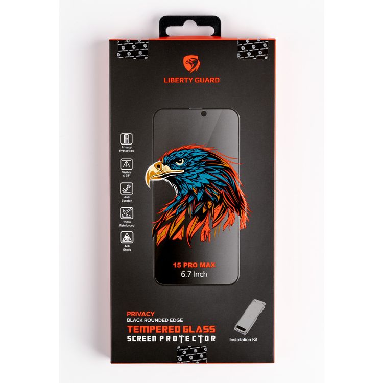 Liberty Guard iPhone 15 Pro Max لتغطية كاملة 2.5D للخصوصية من الزجاج المقوى الثلاثي مع مجموعة التثبيت - حافة سوداء/الخصوصية