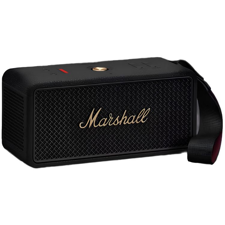 سماعة مارشال ميدلتون اللاسلكية المحمولة بتقنية البلوتوث مع الإصدار 5.3، مدى نقل حتى 60 متر، تشغيل لمدة تصل إلى 30 ساعة، مدة شحن 3 ساعات، مستوى مقاومة الماء IP67، وظيفة باور بنك، ميكروفون مدمج - باللون الأسود / النحاسي.
