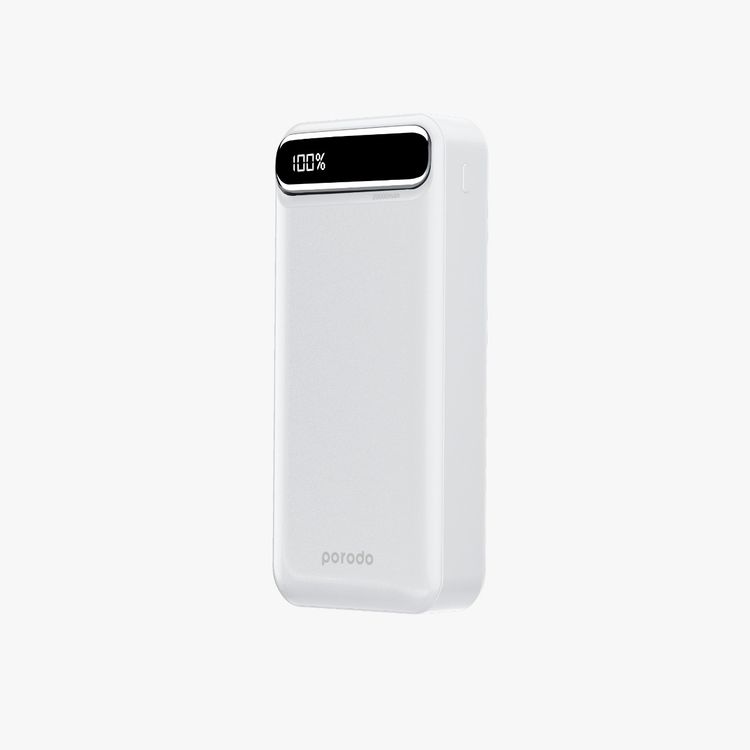 بنك طاقة بورودو بسعة 20000 مللي أمبير مع شاشة رقمية، شحن جهازين في نفس الوقت، منافذ USB-A وType-C، اللون أبيض.