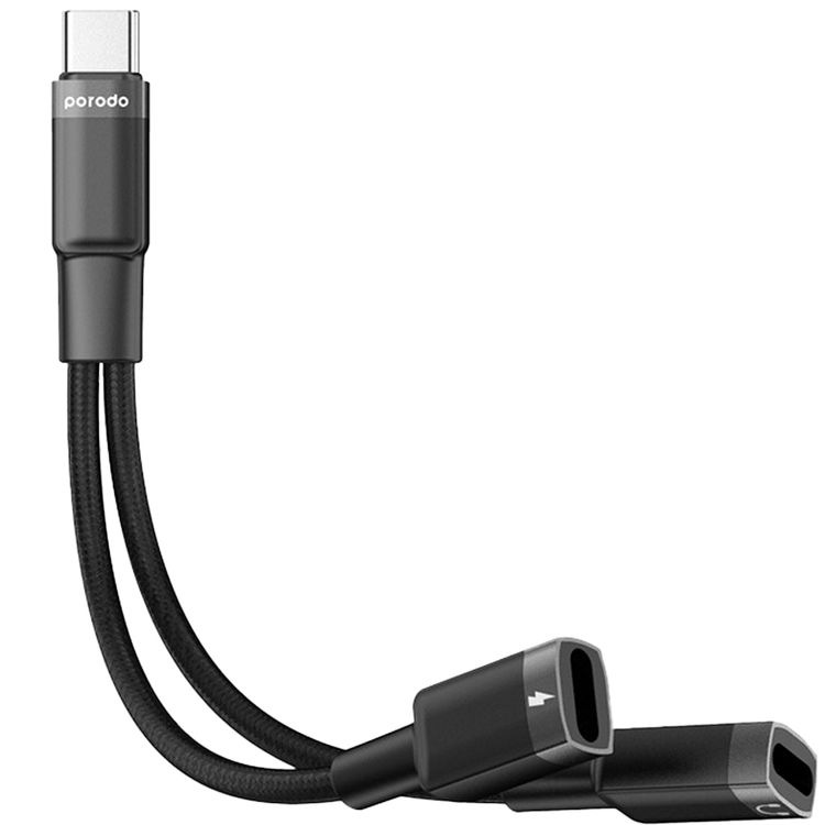 محول الصوت والشحن من Porodo مع موصل Type-C، صوت واضح بشكل كريستالي، شحن أمثل، مدخلات صوت وشحن USB-C، توافق واسع، الشحن واللعب بشكل متزامن.
