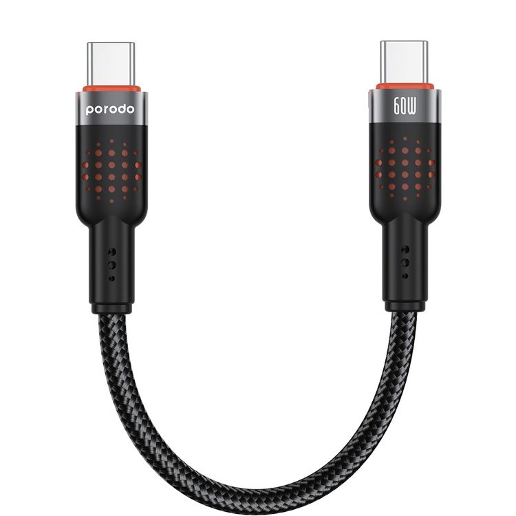 Porodo كابل USB-C إلى USB-C مضفر مع توصيل طاقة 60 واط، سرعة نقل 480 ميجابت في الثانية، تصميم مضفر وخالي من التشابك، عمر افتراضي أكثر من 15000 ثني، شحن سريع ومزامنة البيانات - أسود