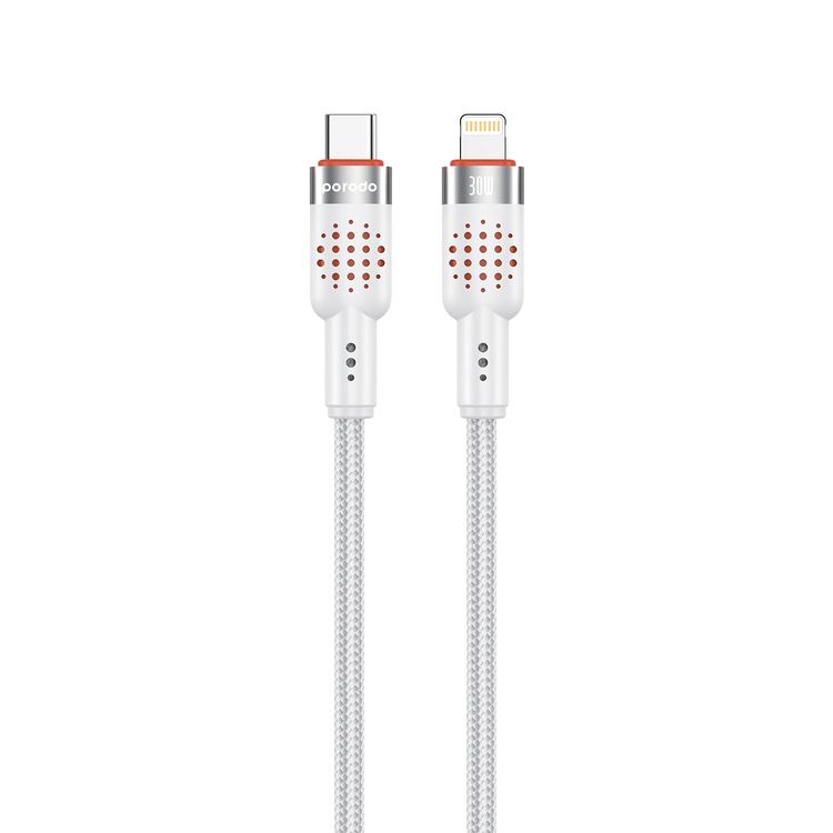كابل بورودو مضفر من النوع C إلى لايتنينج مع قدرة توصيل طاقة 30 واط، بطول 1.2 متر، سرعة نقل 480 ميجابت في الثانية، عمر افتراضي لأكثر من 15,000 انحناء، تصميم خالٍ من التشابك - أبيض