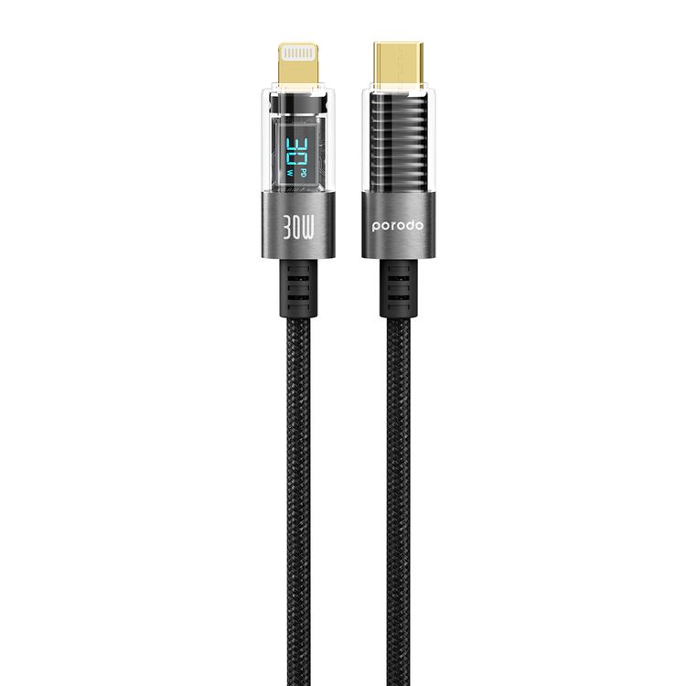 كابل USB-C إلى Lightning مضفر شفاف من Porodo للشحن ونقل البيانات، مكونات عالية الجودة، خالٍ من التشابك، سرعة نقل بيانات 480 ميجابت في الثانية - أسود