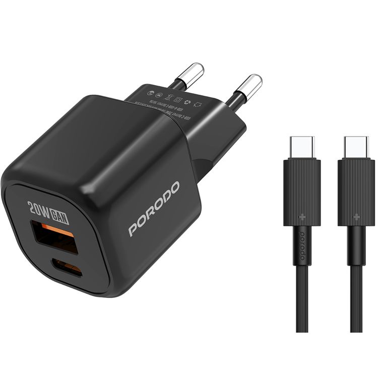 شاحن حائط بورودو بمنفذين مع كابل Type-C إلى Type-C متضمن، بقوة 20 واط للتوصيل بالطاقة، قابس EU، QC 18W، شحن متزامن، حماية من الحرارة الزائدة، مخرجات USB-C و USB-A - أسود