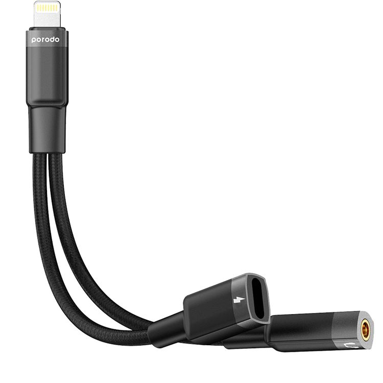 محول صوت وشحن Porodo Lightning Connector مع شحن مثالي، صوت نقي، توصيل وتشغيل، شحن وتشغيل في آن واحد - أسود