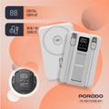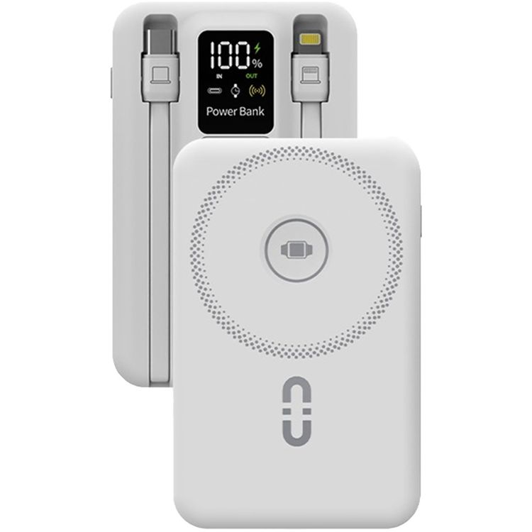 بورودو بنك طاقة لاسلكي مغناطيسي 10000 مللي أمبير/ساعة مع حامل كابل مدمج USB-C + Lightning، شحن متزامن، شاشة رقمية، PD 22.5 واط - أبيض