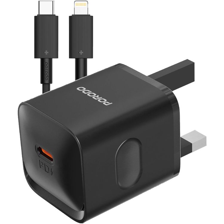 Porodo شاحن حائط بقوة 20 واط (UK) مع كابل Type-C إلى Lightning، حماية من الحرارة الزائدة، محمول - أسود