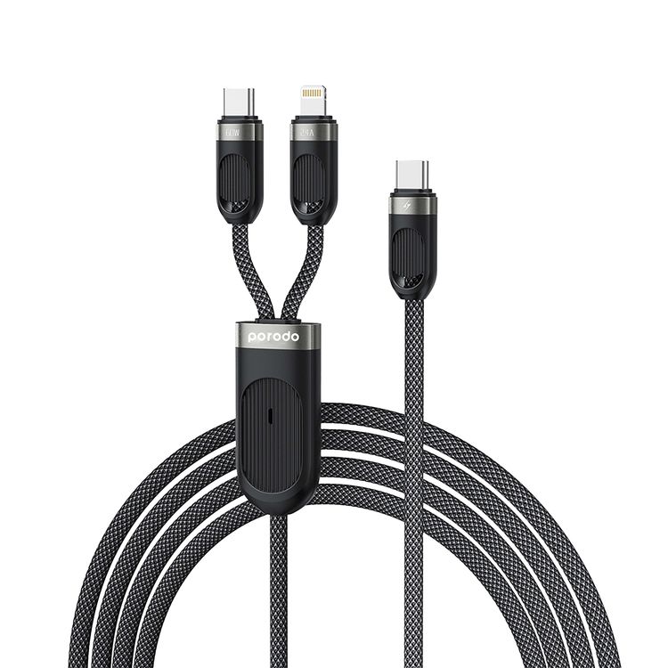 كابل الشحن السريع من Porodo بنوع Type-C وLightning مع واجهة إدخال Type-C، يدعم الشحن المتزامن، متوافق عالميًا، قوة خرج Lightning تصل إلى 12 واط، مصنوع من مادة خارجية مضفرة - لون أسود.