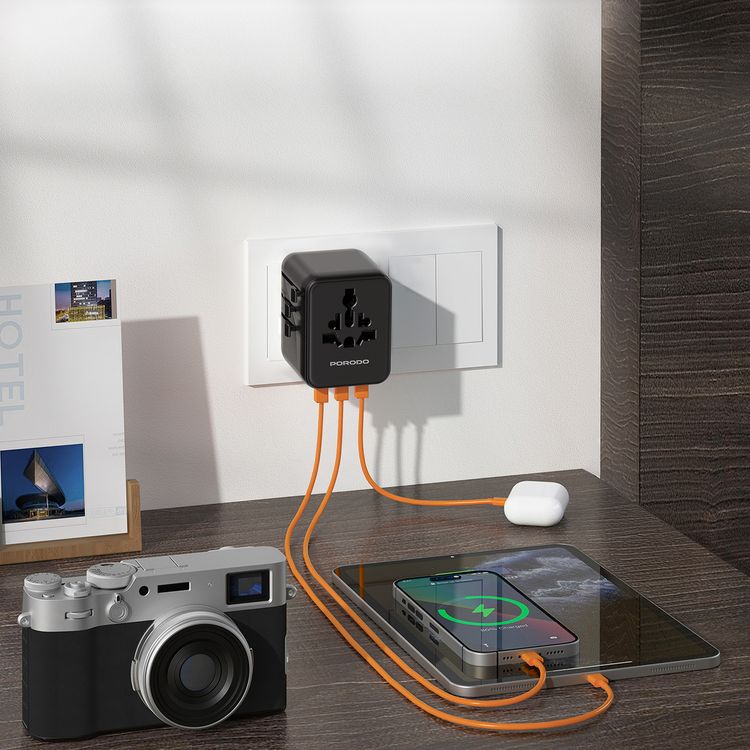 شاحن سريع للسفر من Porodo Universal GaN، منفذين USB-C، منفذ USB-A، يدعم قابس المملكة المتحدة/الاتحاد الأوروبي/الولايات المتحدة وأستراليا، متوافق عالميًا، شحن متزامن - أسود