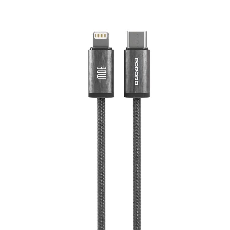 Porodo كابل مضفر من نوع USB-C إلى Lightning بطول 1.2 متر، شحن سريع ونقل بيانات، تصميم خالي من التشابك، مكونات عالية الجودة - أسود