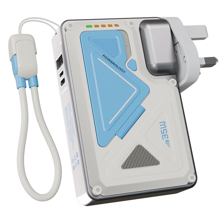 باورولوجي باور بانك 10000mAh مغ سيف مع شاحن حائط مدمج، تسليم طاقة 35 واط، شحن لأربع أجهزة، مخرج لاسلكي 15 واط، كابل USB-C إلى USB-C مدمج - أبيض